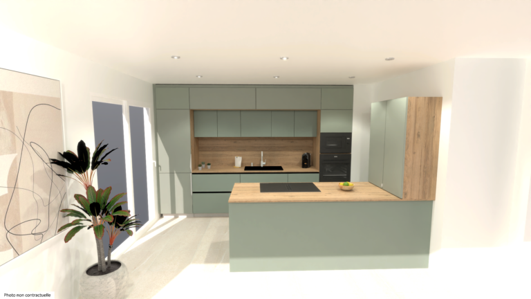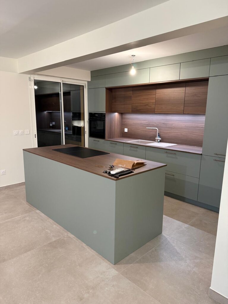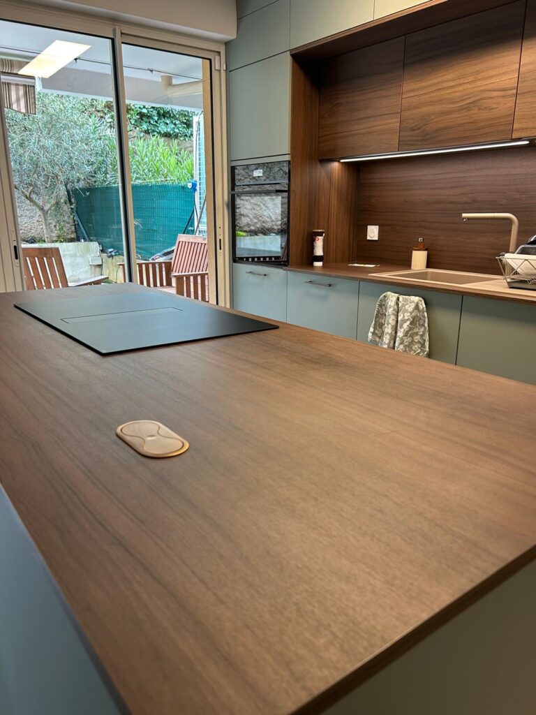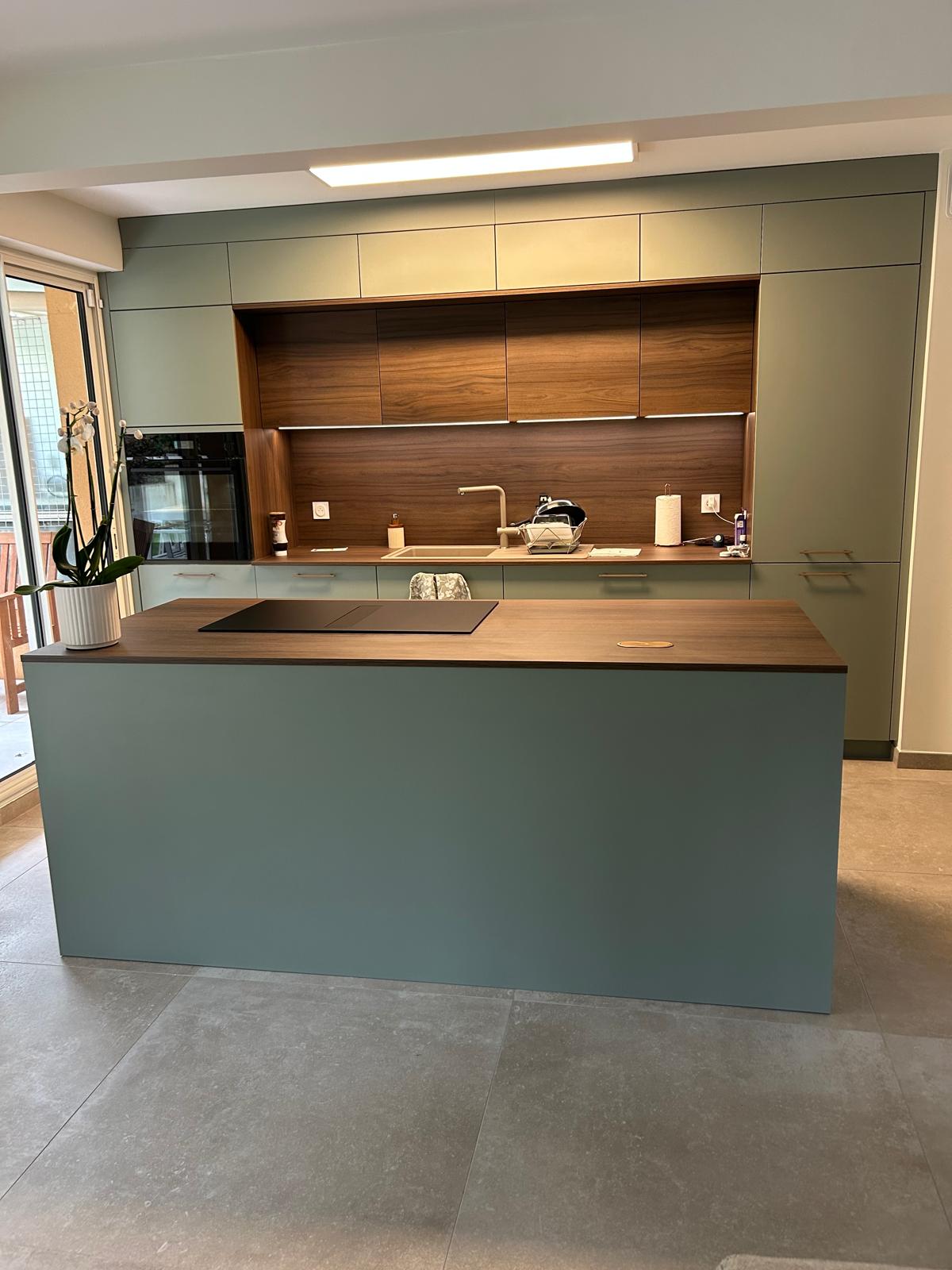 D’autre part, un véritable travail a été effectué pour créer une harmonie entre façades mates et bois naturel. Le contraste entre les teintes douces des façades et la chaleur du bois apporte du relief tout en conservant une atmosphère élégante.